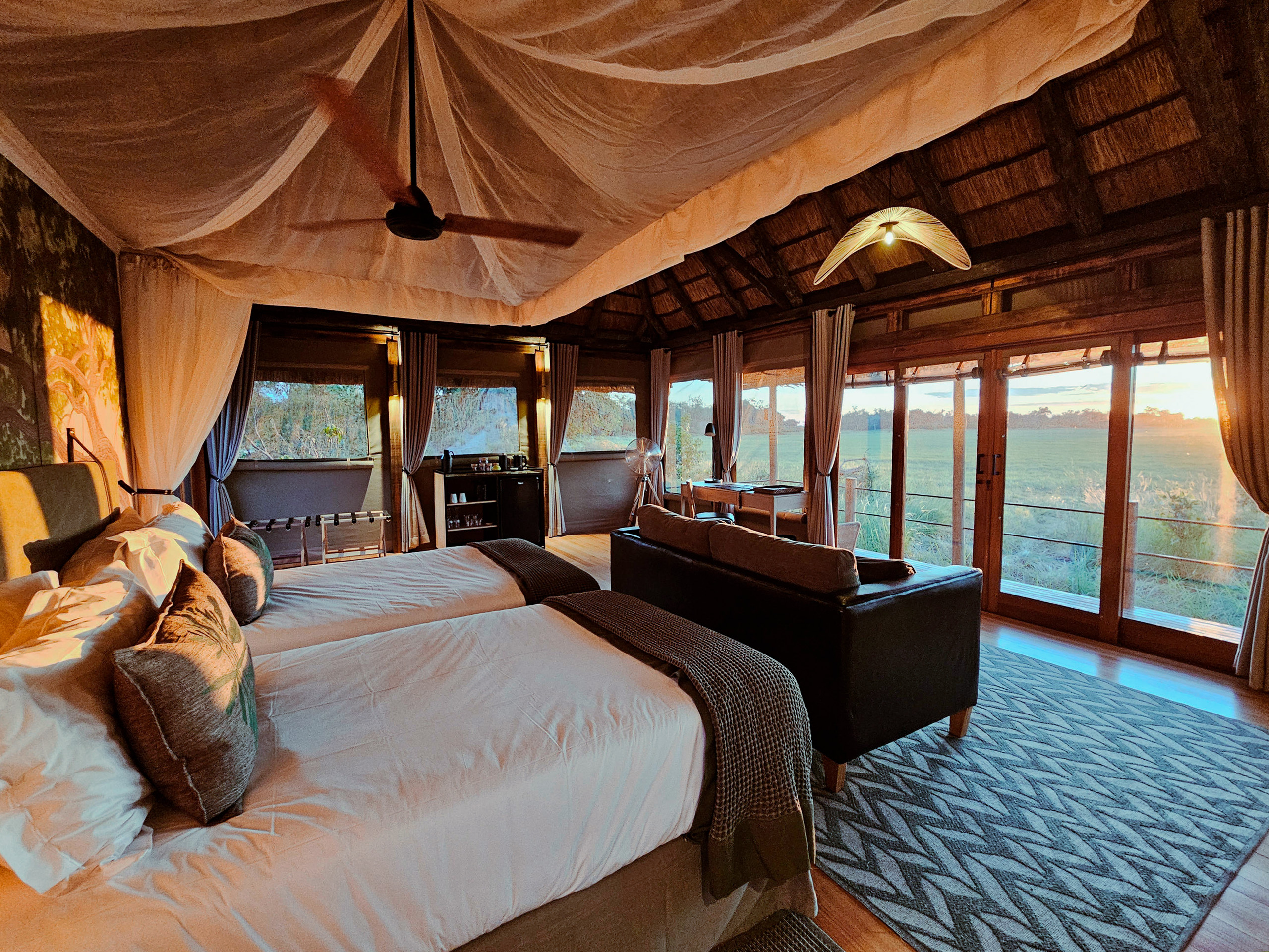 Die 15 stilvollen Luxuszelte sind zum Fluss ausgerichtet und verfügen über je ein eigenes Bad sowie private Terrassen mit Blick in die Natur. Der großzügige Hauptbereich bildet das Herz des Camps. Er umfasst eine stimmungsvolle Feuerstelle, einen Pool, eine Bar, ein Spa sowie mehrere offene Essbereiche, die das Safari-Gefühl unter freiem Himmel zelebrieren.